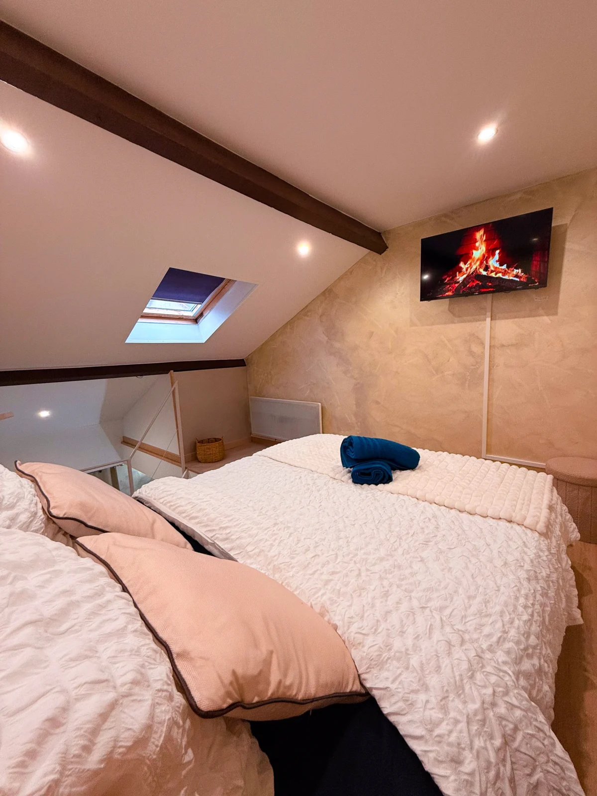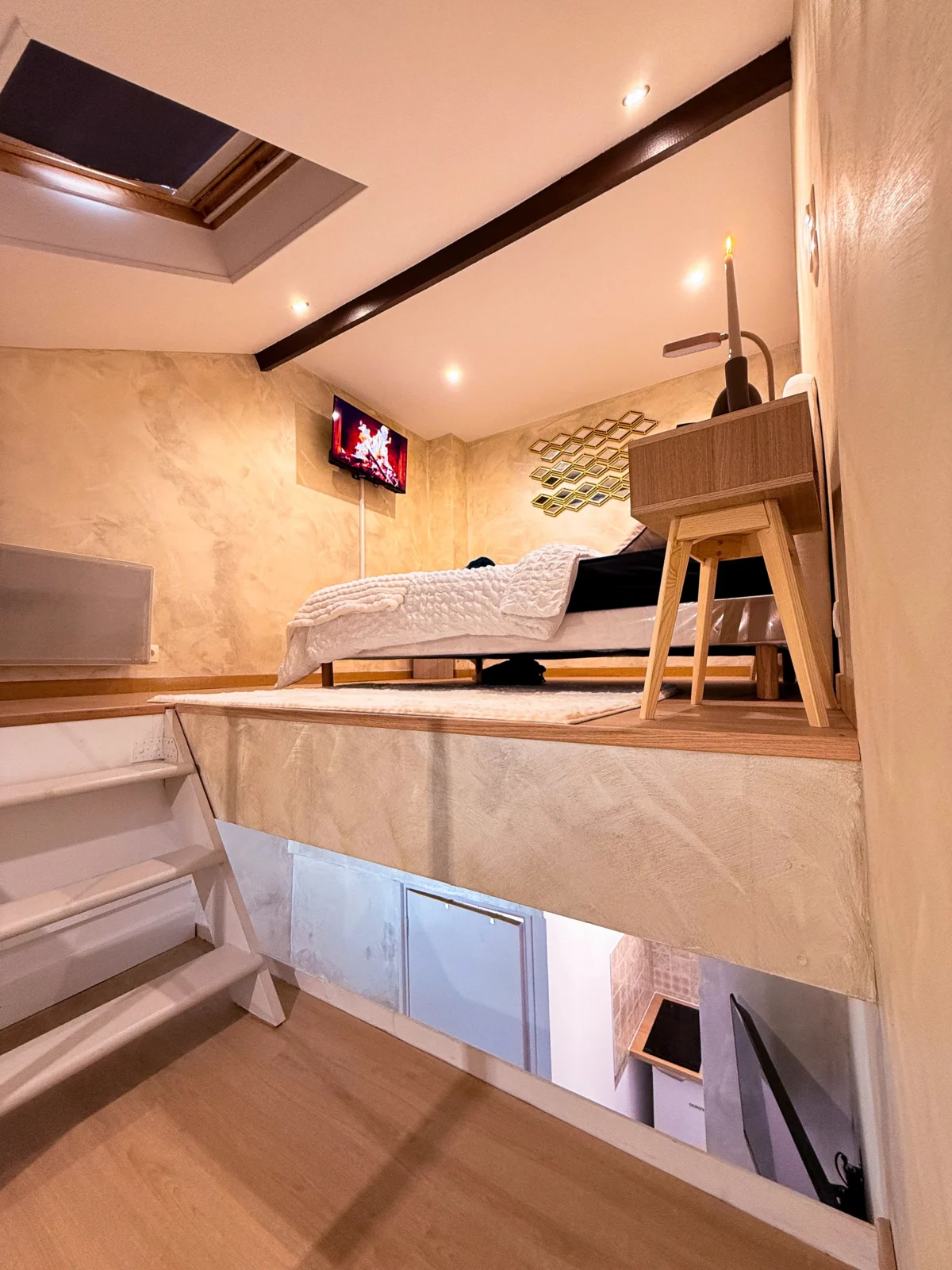 À l’étage, une chambre en mezzanine cosy vous attend avec literie confortable et ambiance intimiste.