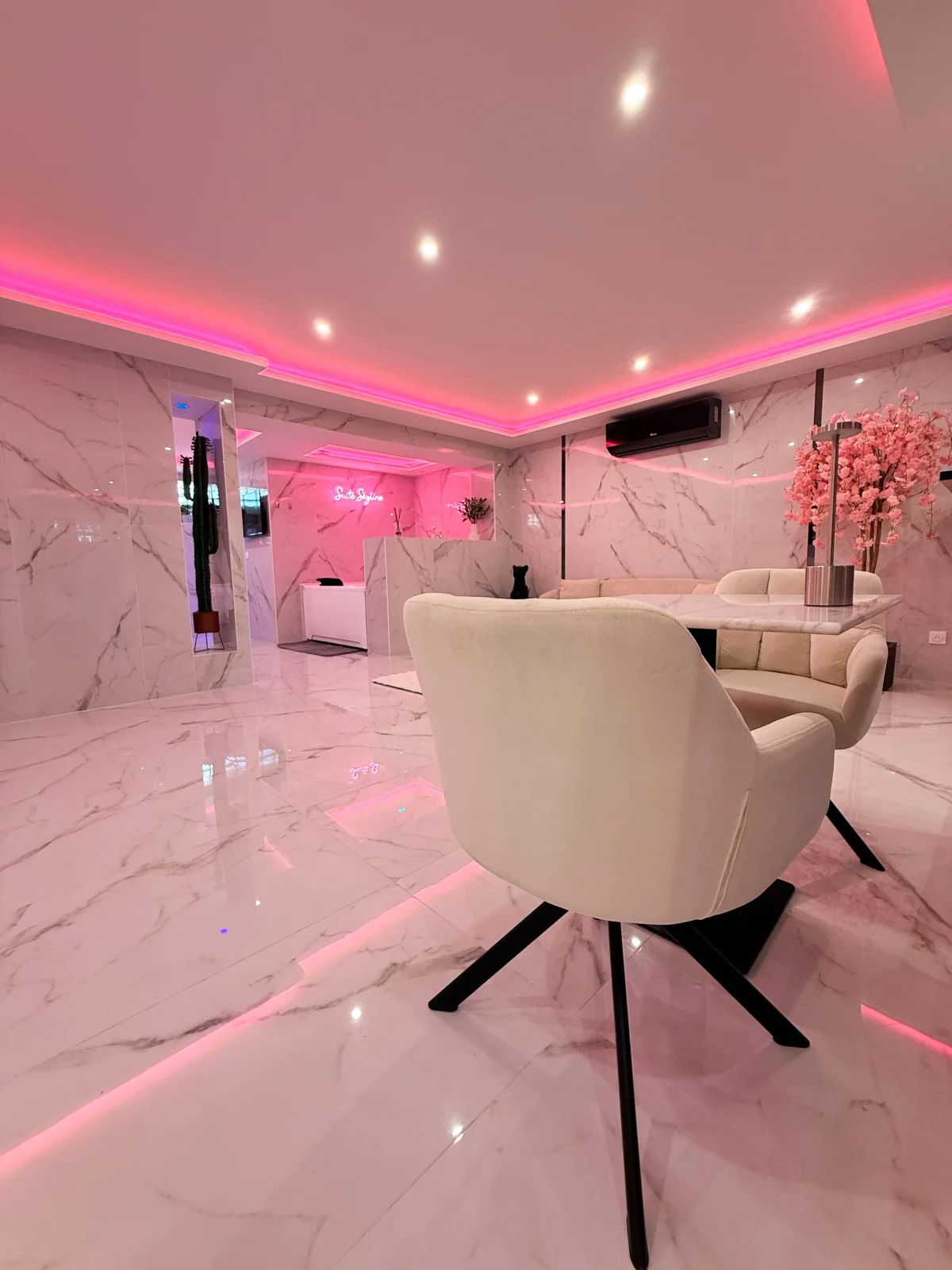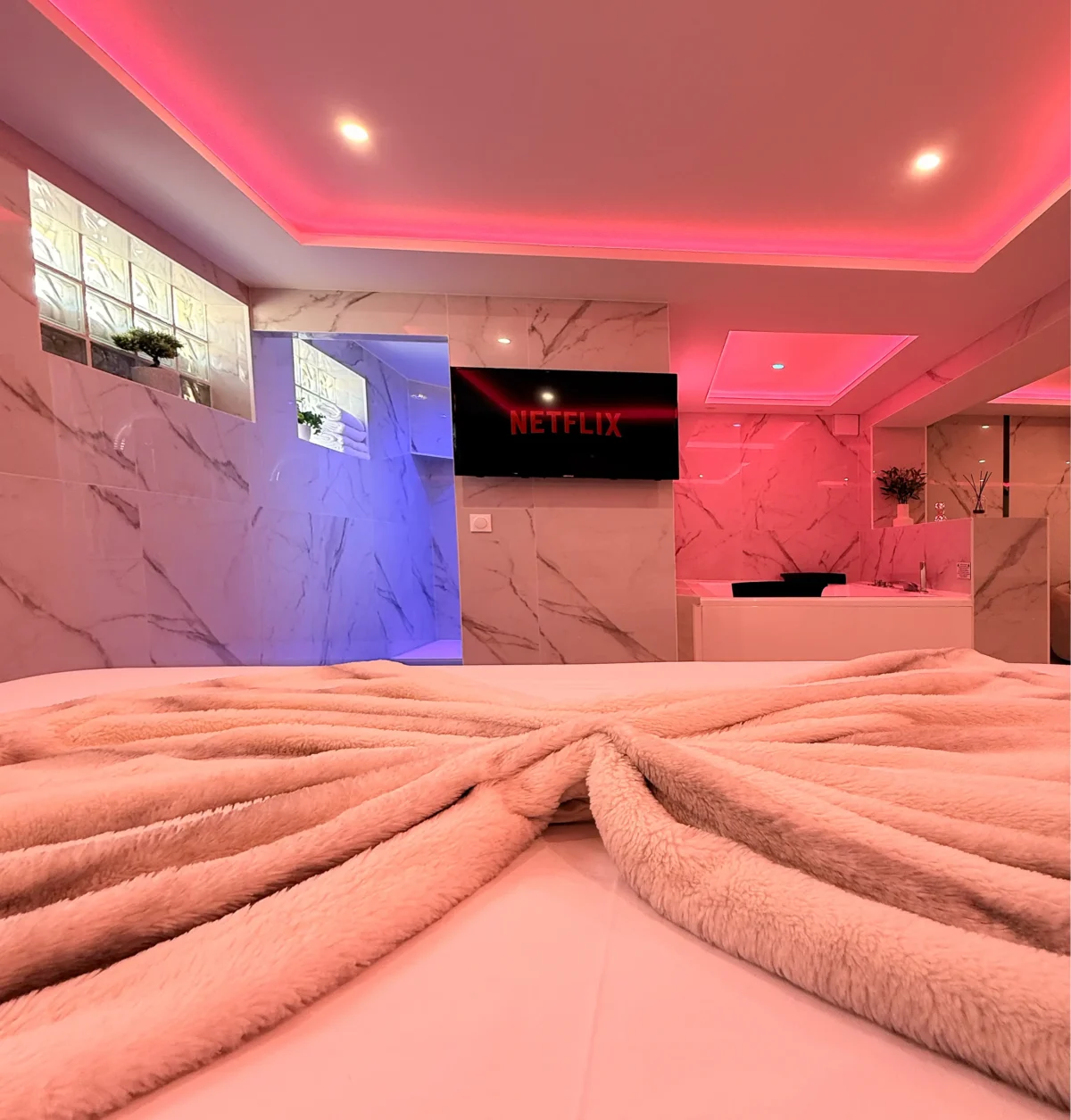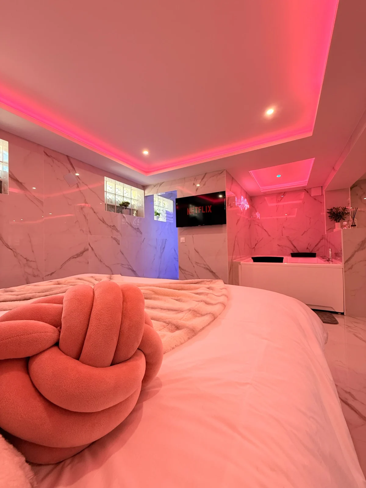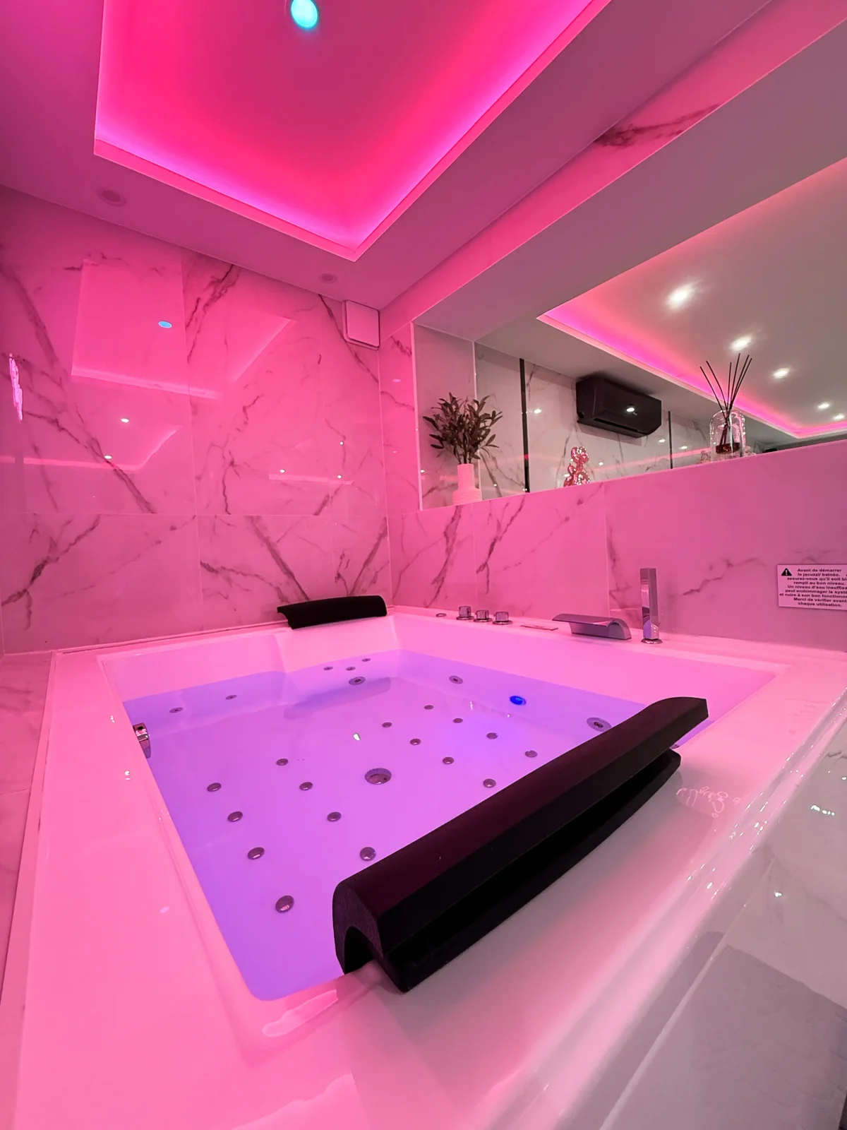 Vous serez immédiatement séduits par le marbre blanc et la décoration épurée qui offrent une atmosphère élégante et apaisante. Les lumières d’ambiance roses créent une touche romantique unique, parfaite pour vos moments à deux.