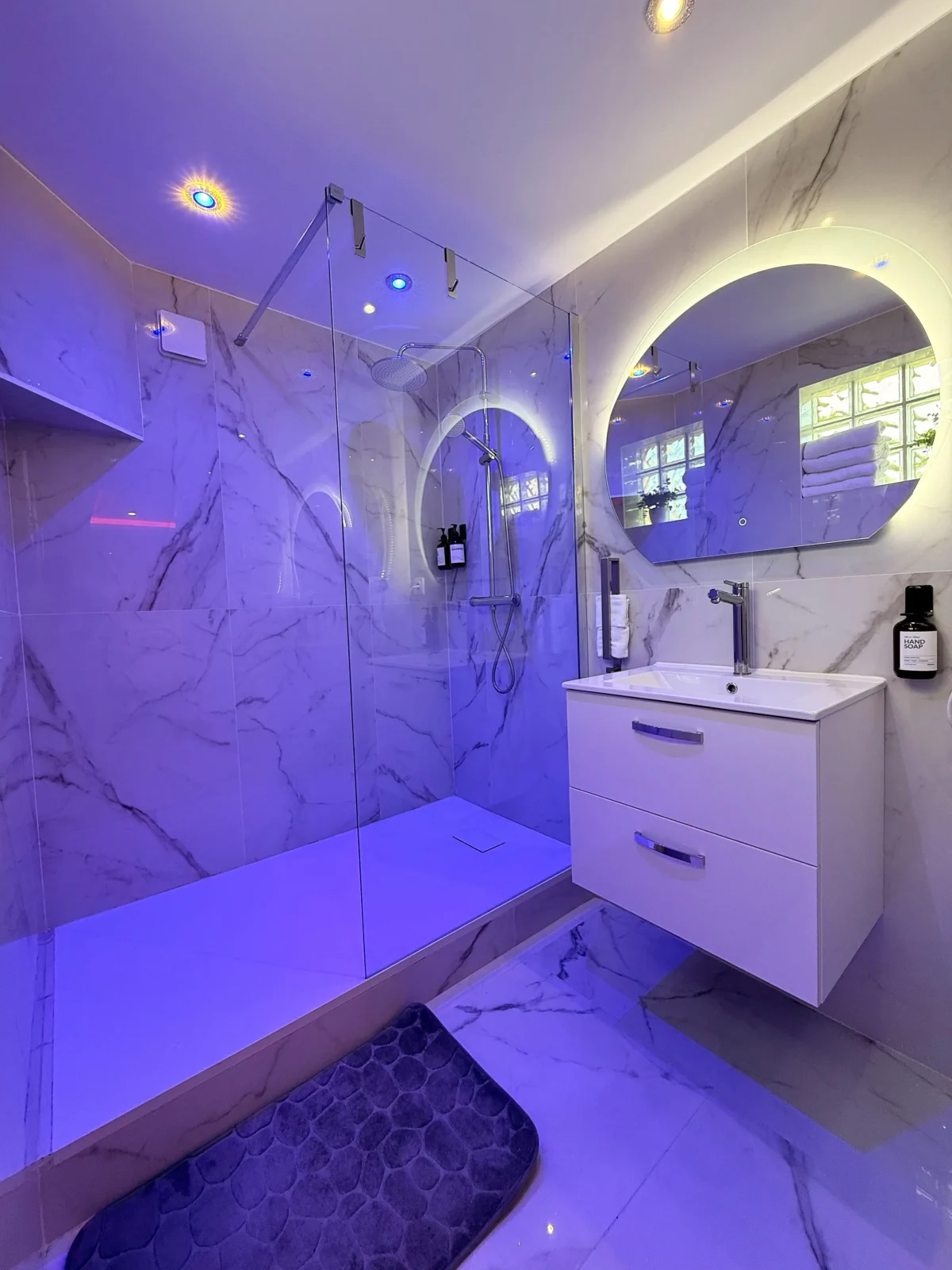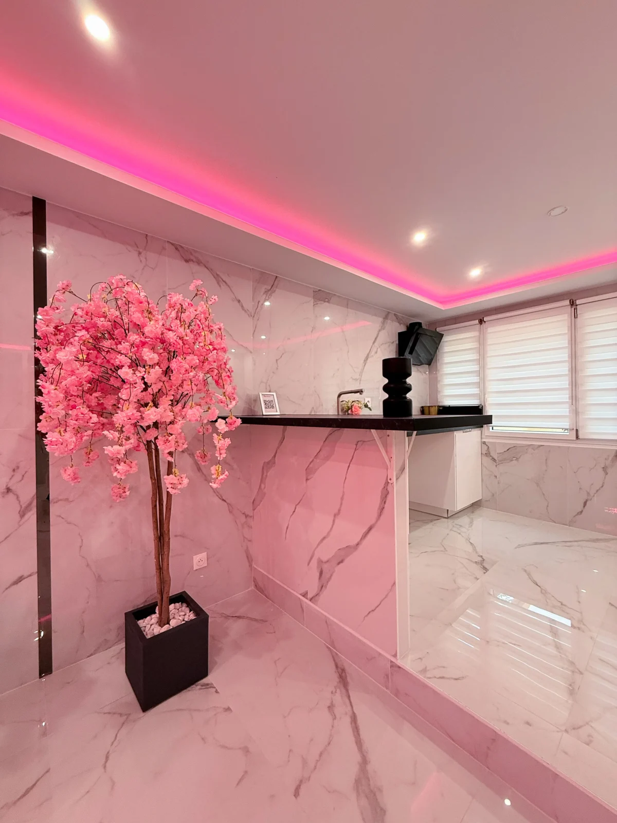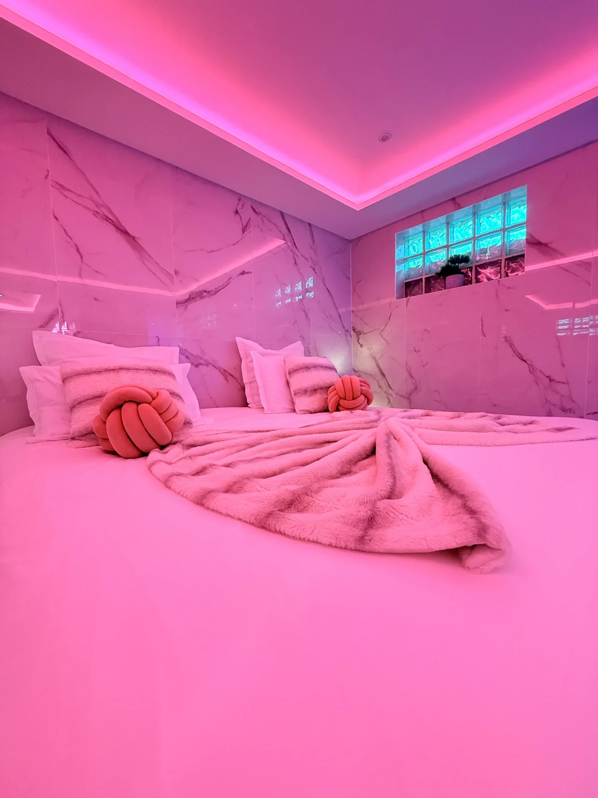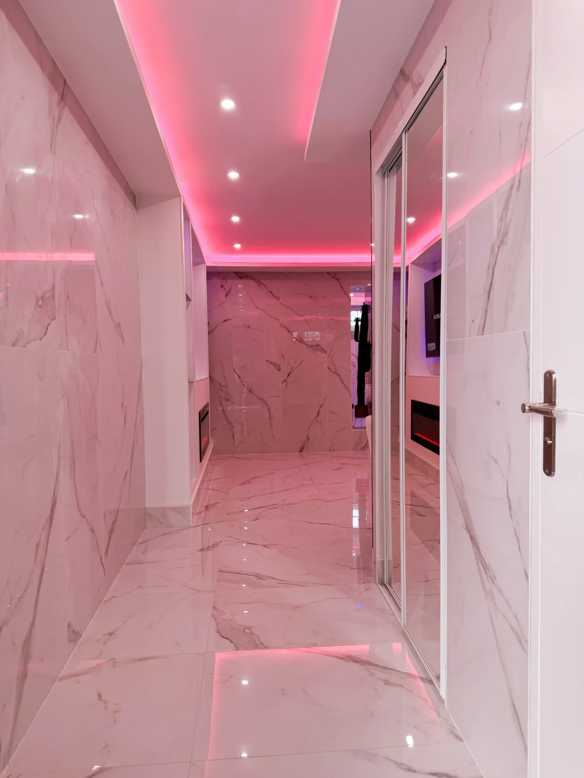 Vous serez immédiatement séduits par le marbre blanc et la décoration épurée qui offrent une atmosphère élégante et apaisante. Les lumières d’ambiance roses créent une touche romantique unique, parfaite pour vos moments à deux.
