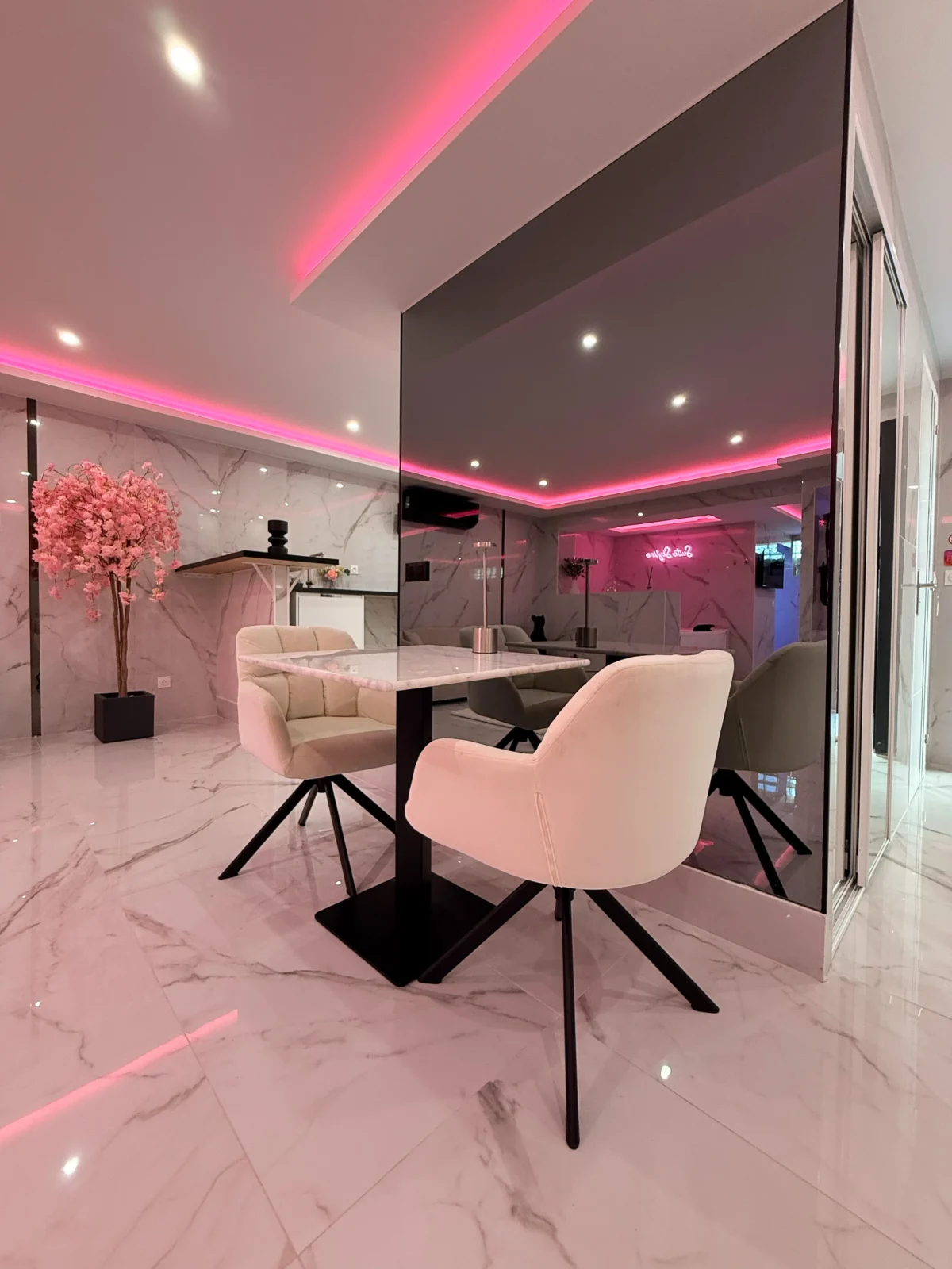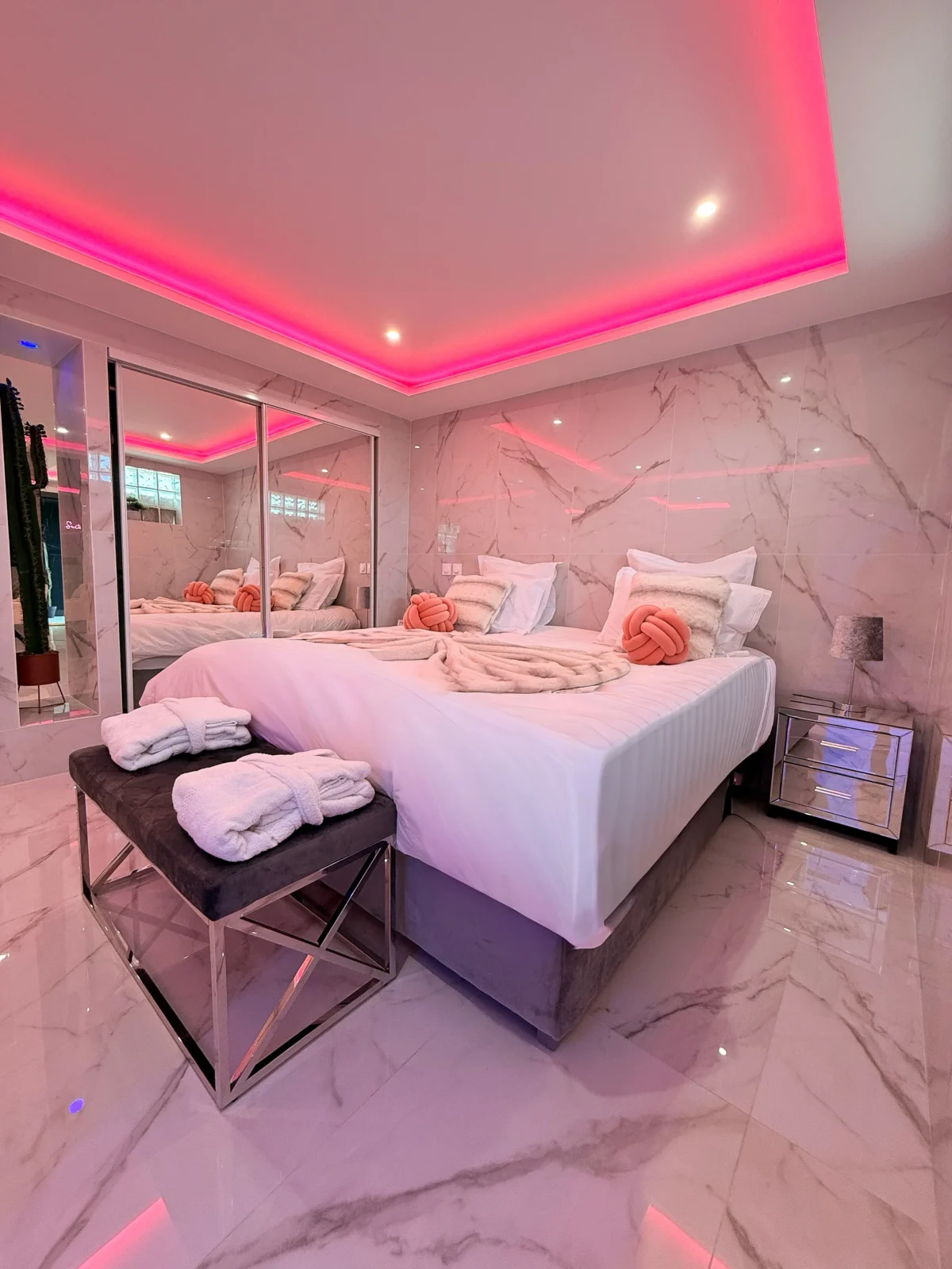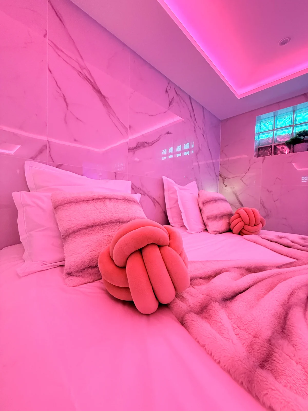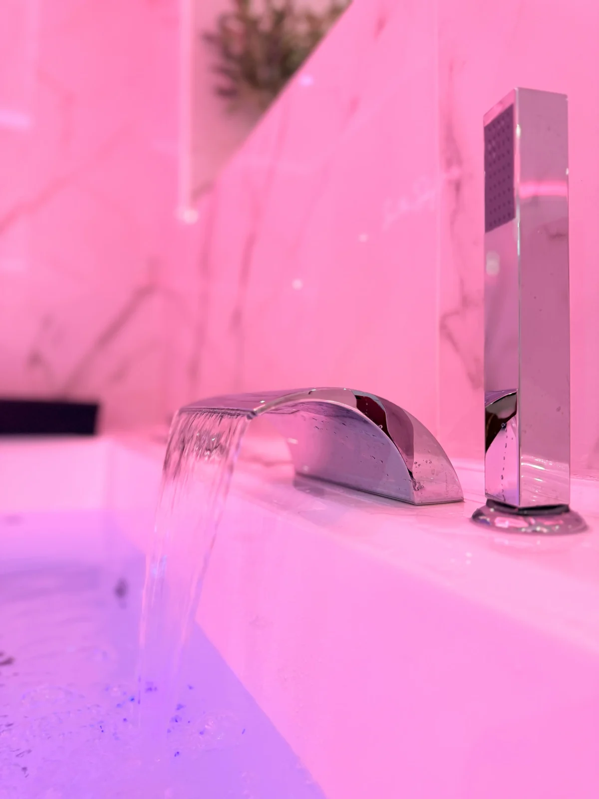 Vous serez immédiatement séduits par le marbre blanc et la décoration épurée qui offrent une atmosphère élégante et apaisante. Les lumières d’ambiance roses créent une touche romantique unique, parfaite pour vos moments à deux.