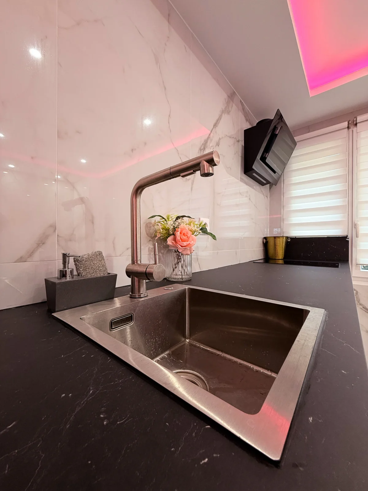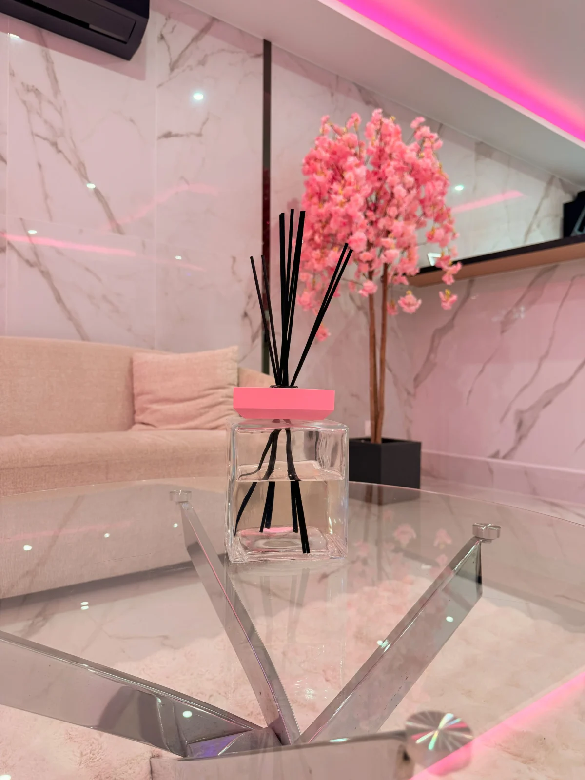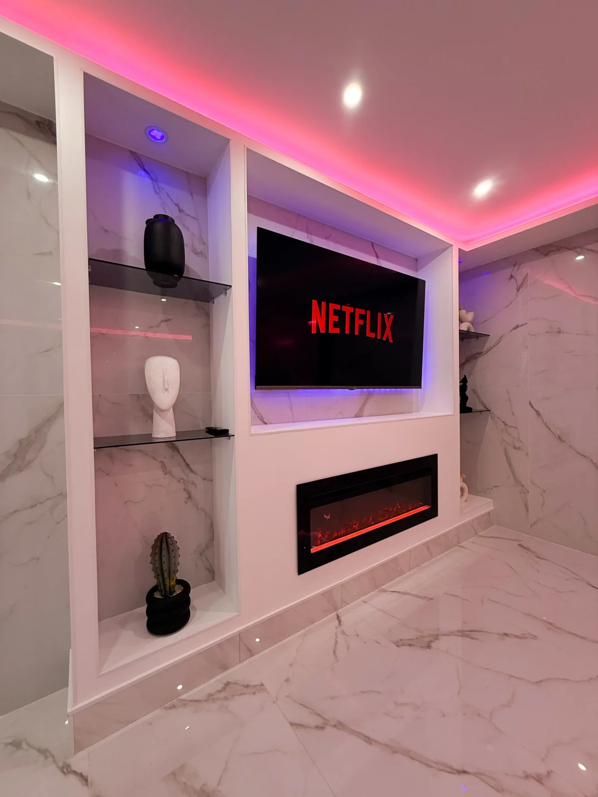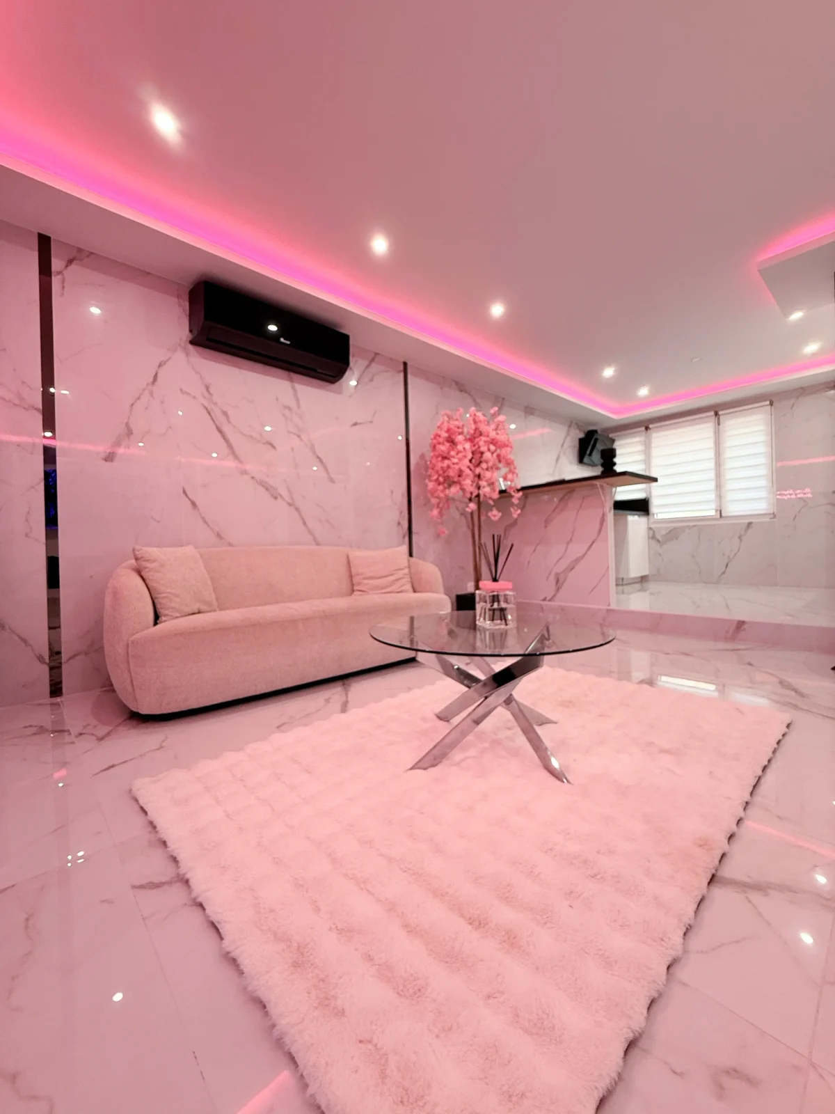 Vous serez immédiatement séduits par le marbre blanc et la décoration épurée qui offrent une atmosphère élégante et apaisante. Les lumières d’ambiance roses créent une touche romantique unique, parfaite pour vos moments à deux.